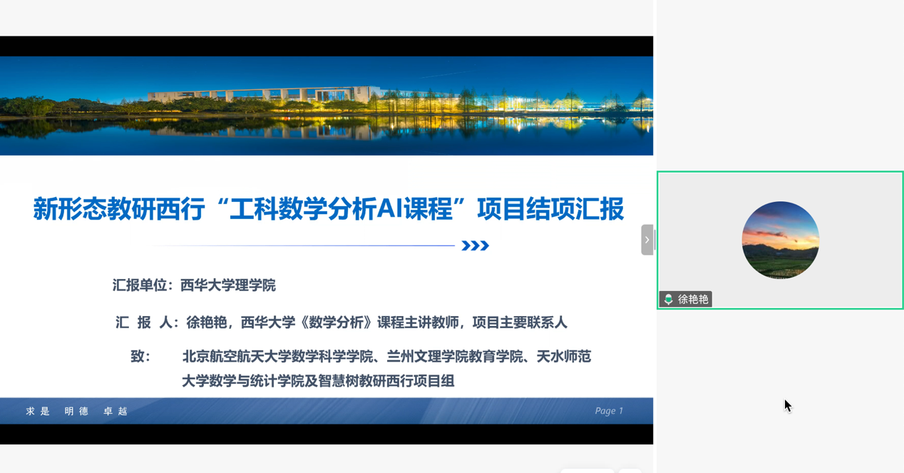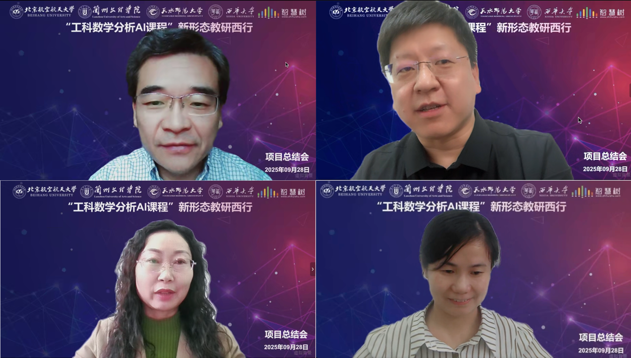 为深入推进教育部“慕课西部行2.0行动”,积极探索基于新形态AI课程的教研教学模式,由北京航空航天大学联合西华大学、兰州文理学院和天水师范大学共同开展的“工科数学分析AI课程”新形态教研西行项目,于2025年9月28日下午顺利召开线上工作总结会。来自北京航空航天大学、西华大学、兰州文理学院、天水师范大学等高校的领导代表及项目组成员齐聚云端,总结项目成果,交流教学经验,并共同谋划后续合作方向。