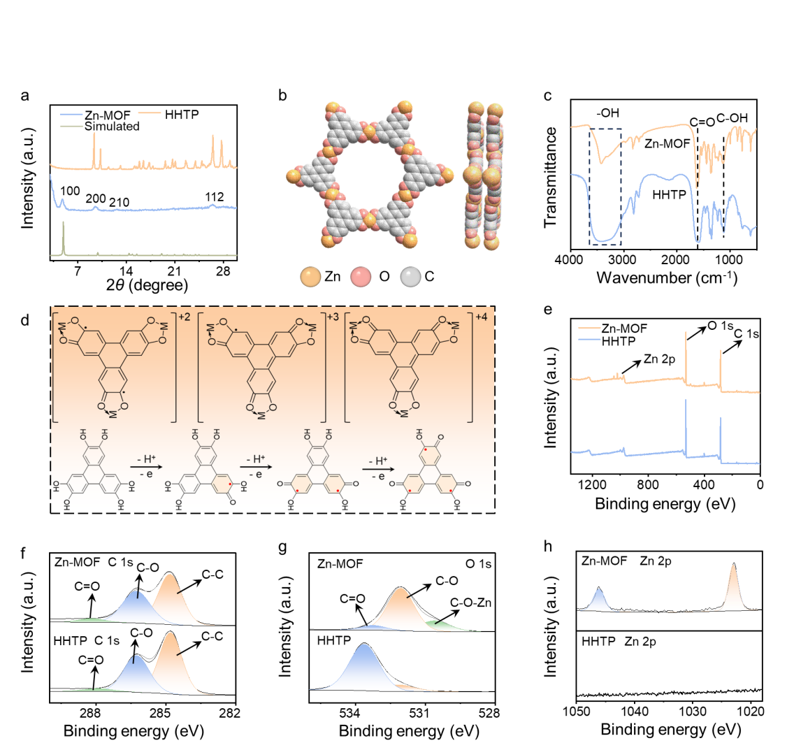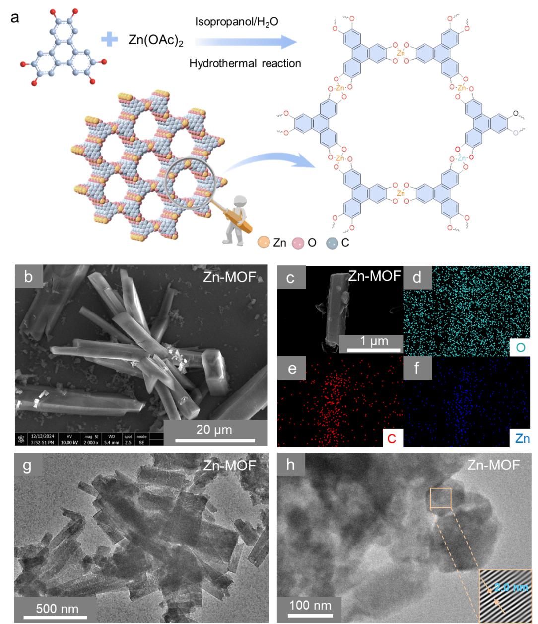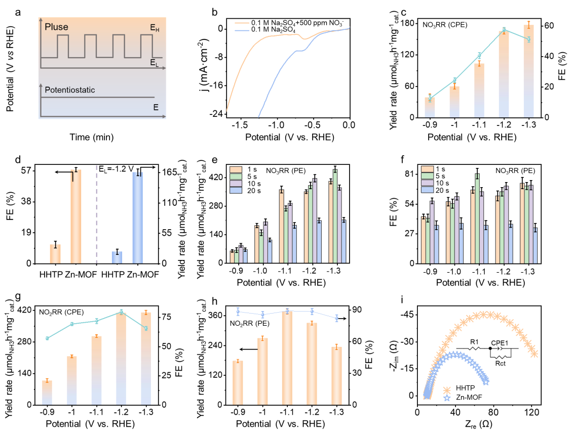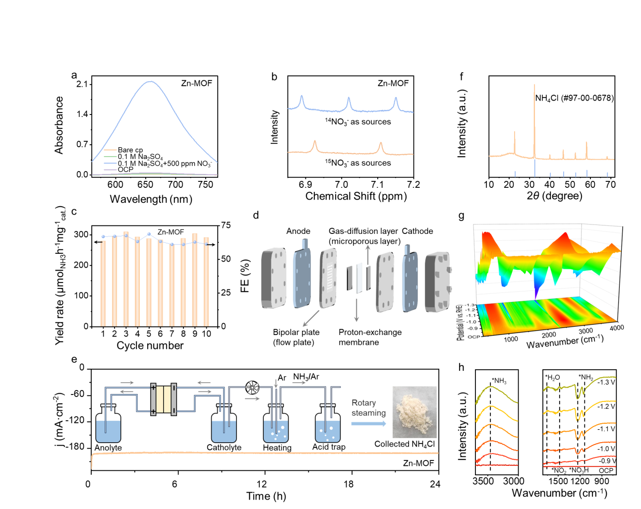 在本文中,作者采用溶剂热法合成了具有精确原子结构的导电棒状锌基金属有机框架(Zn-MOF)电极,并通过脉冲电解策略以调控NO₃RR过程中Zn-MOF电极附近NO₂⁻中间体的逐步积累与转化。结果表明,与恒电位电解相比,该策略使氨产率和法拉第效率(FENH₃)均提升一倍。此外,在流动电解池测试中,Zn-MOF催化剂在-1.1 V(vs RHE)下保持超过180 mA·cm⁻²的还原电流密度。在连续循环测试和长时间稳定性测试中,NO₃RR性能均无明显衰减。长时间稳定性测试后,从电解液中成功提取出了固态氯化铵产品,该实验结果为将废水中的硝酸根转化为高价值氨衍生产品提供了一条可行途径。此外,利用原位红外光谱技术,监测了电化学NO₃RR过程中Zn-MOF催化剂表面形成的关键含氮中间体。本研究为后续设计具有精确原子结构的导电金属有机框架(MOFs),以及通过脉冲电还原技术调控关键电催化反应步骤提供了重要的实验参考。