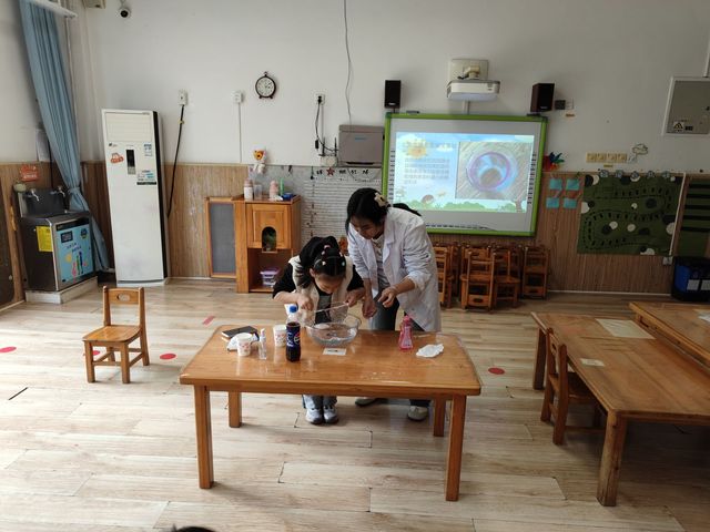 小朋友和志愿者一起做泡泡膜边圆魔法实验