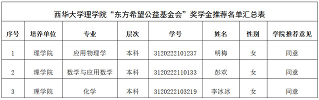 关于“东方希望公益基金会”奖学金名单的公示