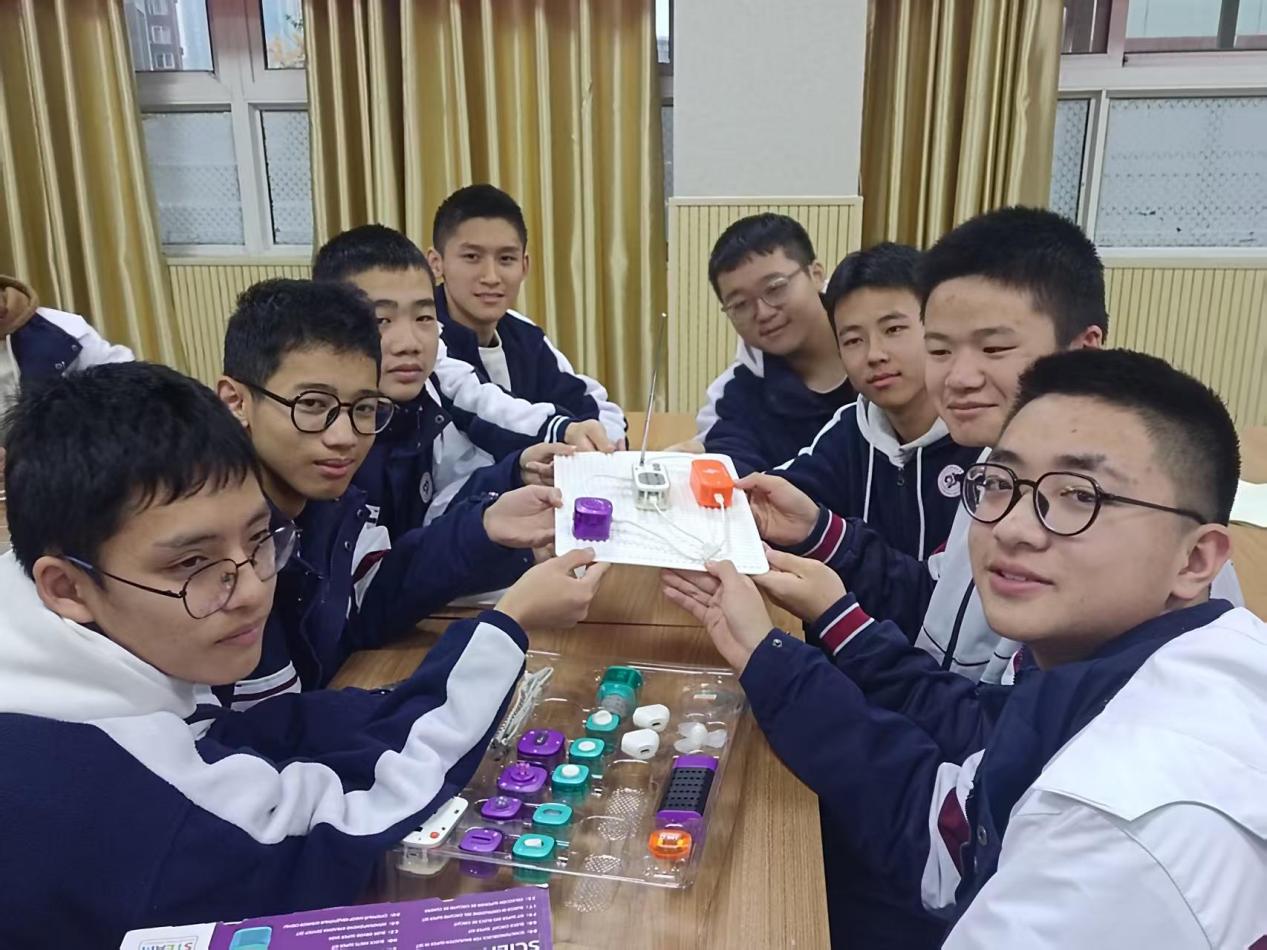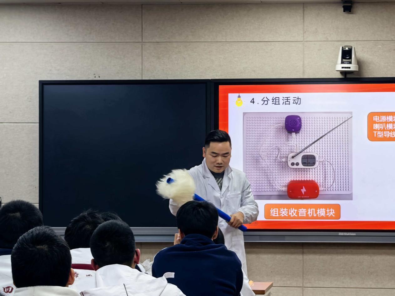 讲座现场,范志祥老师凭借幽默风趣的讲解技巧,将电路连接、能量转换等物理基础知识与生活中的常见现象相结合,让原本抽象的原理变得通俗易懂。在随后的电子积木小实验环节,高一同学们以小组为单位协作动手,在志愿者的答疑帮助下,成功搭建出七彩灯、变音器、收音机等装置,亲身感受物理科学在实践中的奇妙应用,现场互动氛围十分热烈。