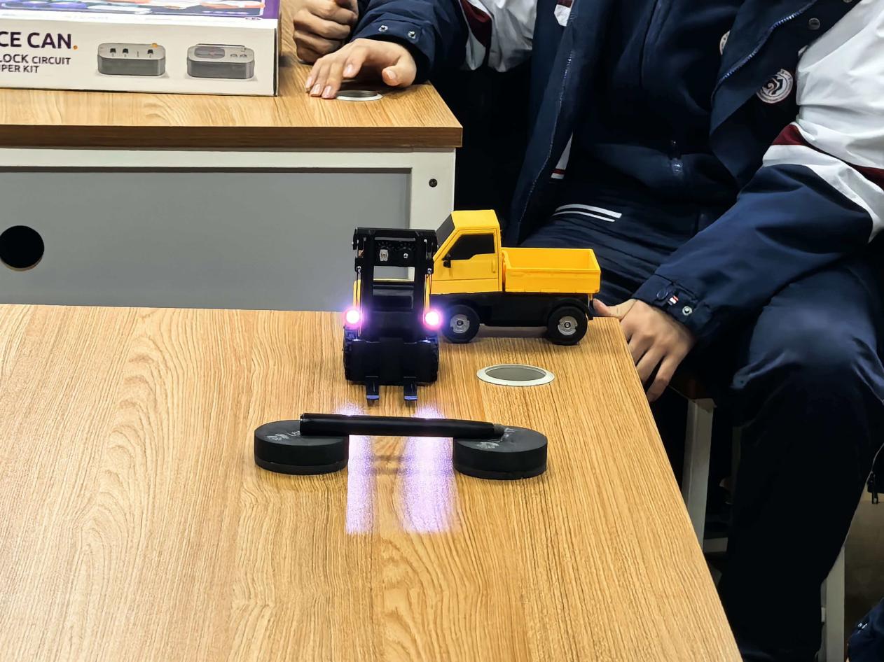 值得一提的是,在活动最后的互动环节,科普团队特别增加了多项趣味物理体验内容。范老师现场展示了奇妙的静电现象,并组织同学们开展 “同种电荷相互排斥” 和 “手拉手感受静电” 两项集体小活动,让大家在亲身参与中直观理解静电原理;同时,团队还带来了 “3D 打印 + 硬件拼装” 成果展示,通过遥控叉车、遥控货车的现场操作演示,展现了物理原理与现代制造的结合,进一步拓宽了同学们的科学视野。