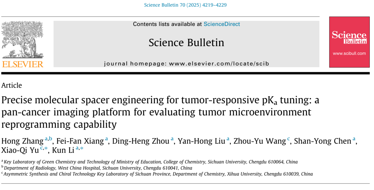 近日,西华大学余孝其教授团队与四川大学李坤教授团队合作在国际顶级期刊《Science Bulletin》(IF = 21.1)发表题为 “Precise molecular spacer engineering for tumor-responsive pKa tuning: a pan-cancer imaging platform for evaluating tumor microenvironment reprogramming capability” 的研究论文,提出基于间隔基的分子工程创新策略,实现 pH 传感探针的精准pKa调控,为泛癌成像、转移灶成像及肿瘤微环境重塑监测提供技术支持。