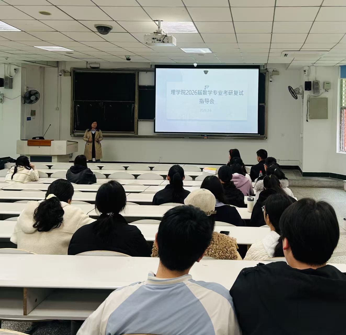 为帮助2026届数学专业考研学生精准把握复试要点,科学高效备战复试,提升应试竞争力,3月6日,理学院成功举办2026届数学专业考研复试指导会。学院副院长王玉兰、数学系主任徐艳艳,数学系教师蒋科、赵兴俊、唐亮,2022级数学专业辅导员阮柳清出席会议,2022级全体数学专业考研学生参加本次指导会。