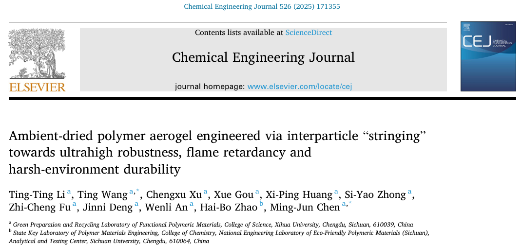 近日,理学院功能高分子材料绿色制备与循环利用研究团队在阻燃保温复合材料研究上取得新进展。相关成果发表在材料领域著名刊物Chemical Engineering Journal(中科院1区TOP,IF: 13.2)、Materials Horizons(中科院2区TOP,IF: 10.7)、ACS Sustainable Chemistry & Engineering(中科院1区TOP,IF: 8.0)、第一作者分别为理学院化学专业硕士研究生李婷婷、勾雪和许成叙,通讯作者为汪婷副教授和陈明军教授,西华大学为第一单位。