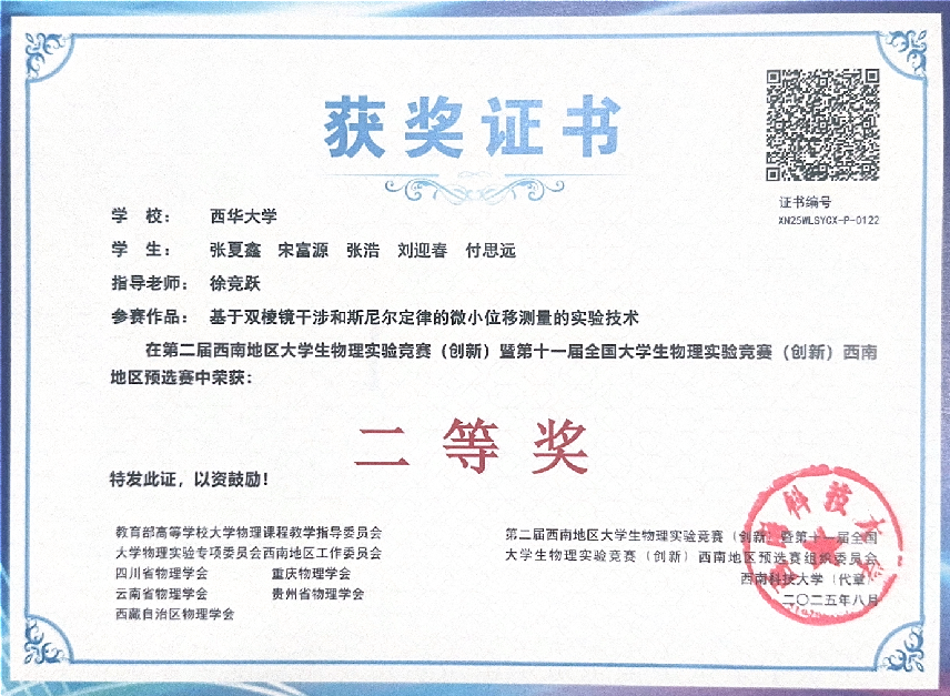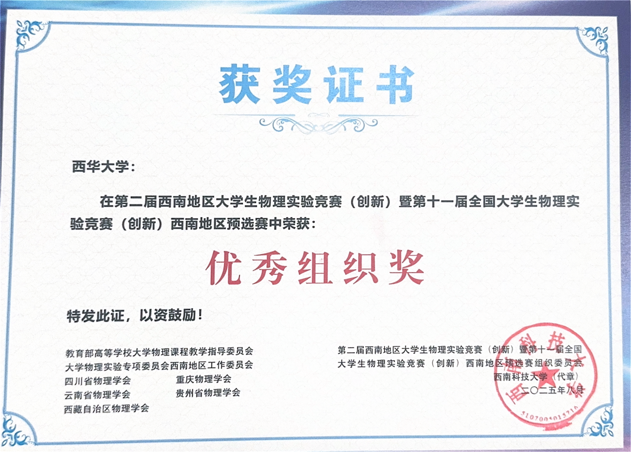据悉,本次竞赛由教育部高等学校大学物理课程教学指导委员会大学物理实验专项委员会西南地区工作委员会、四川省物理学会、重庆市物理学会、云南省物理学会、贵州省物理学会、西藏自治区物理学会联合主办,西南科技大学承办,西华大学协办。此次获奖不仅是对我校物理实验教学成果的肯定,更是对学子创新能力与实践能力的激励。未来,西华大学将继续以各类高水平学科竞赛为抓手,深化实验教学改革,为培养更多具备创新精神与实践能力的高素质人才奠定坚实基础。