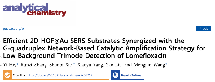 近日,理学院何毅课题组及合作者在分析化学TOP期刊《Analytical Chemistry》(中科院一区,自然指数期刊,IF=6.7)上发表题为“Efficient2DHOF@AuSERSSubstratesSynergized withtheGquadruplexNetwork-BasedCatalyticAmplificationStrategyfor Low-BackgroundTrimodeDetectionofLomefloxacin”的研究论文。何毅博士为该论文第一作者兼通讯作者,2023级硕士研究生张润滋为学生一作,西华大学为第一通讯单位。
