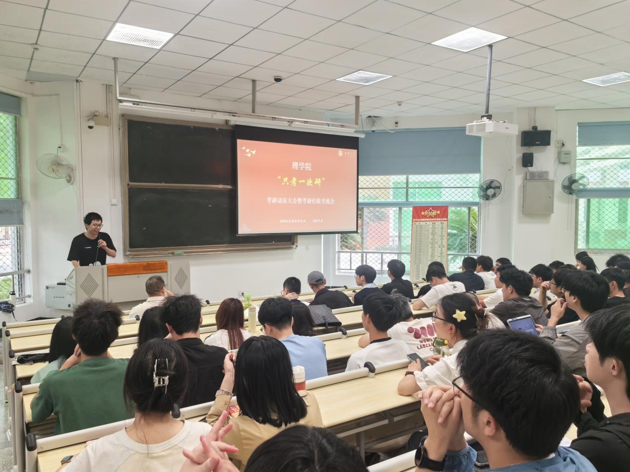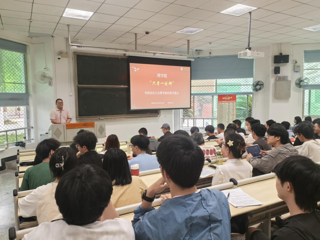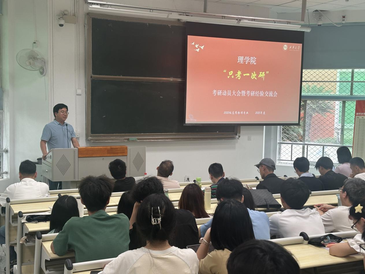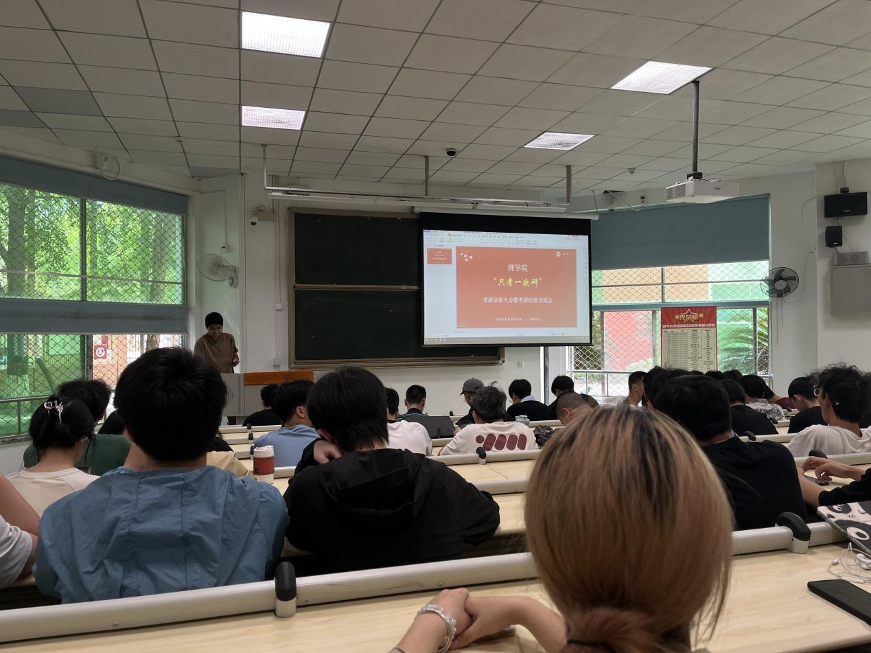 2025年 5月 15 日下午16:00,物理学科 2026届应用物理学本科生考研动员会在郫都校区 4A101 教室顺利举行。本次动员会由 2022级应用物理学辅导员刘东主持,理学院副书记周川、教学副院长李会东、大学物理教学部主任吉驭嫔、物理系副主任范志祥、2022 级应用物理学班导师刘勇涛老师和李川福老师出席,全体 2022 级应用物理学本科生参加。
