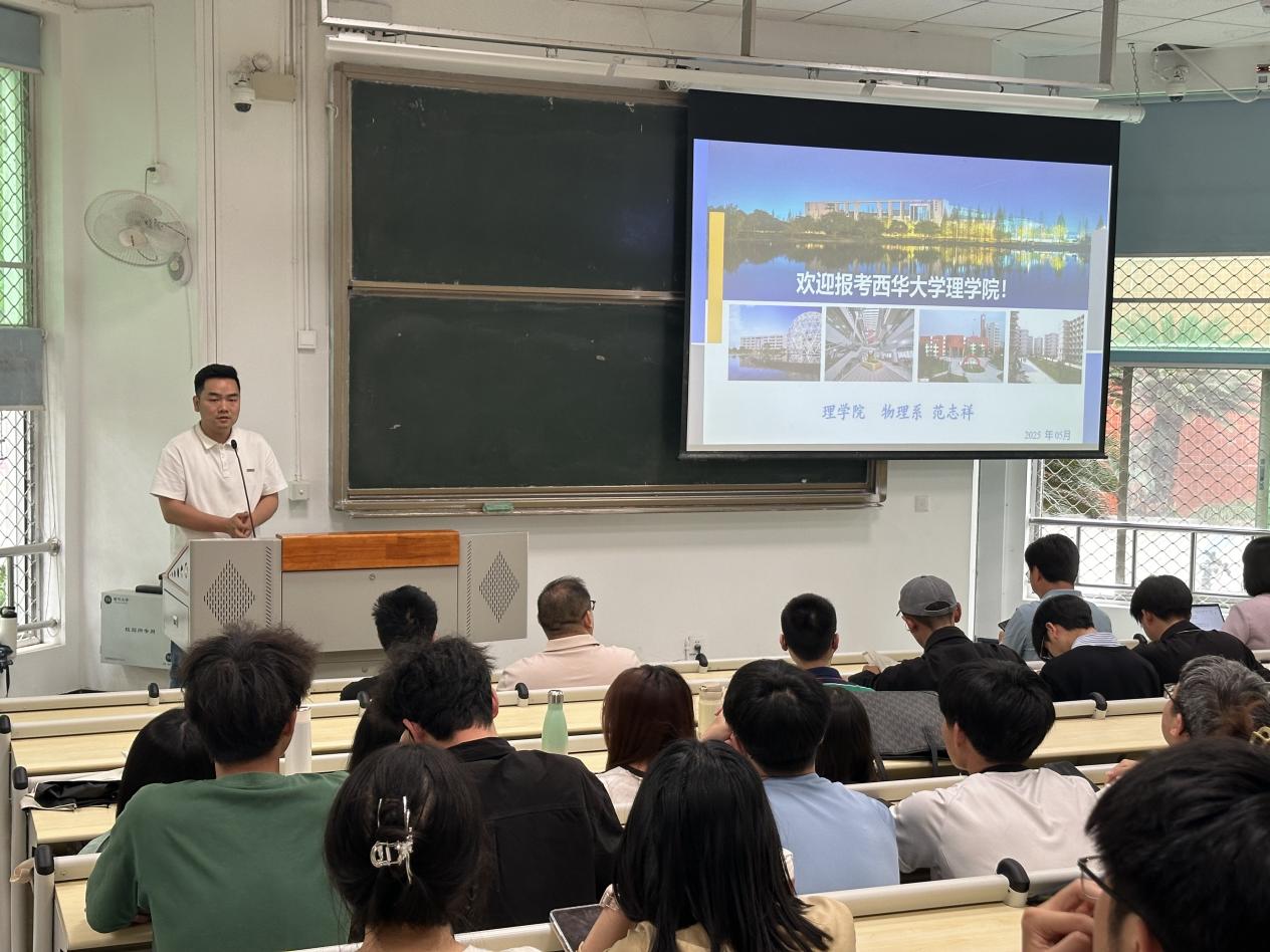 随后,范志祥老师进行了西华大学物理学科的招生宣传。他从西华大学物理学科师资、科研实力、考研考试科目、奖助学金设置等方面进行了详细介绍,并分享了近三年物理学硕士点毕业研究生的就业情况,鼓励同学们结合自身实际情况,选择合适的学校和专业。