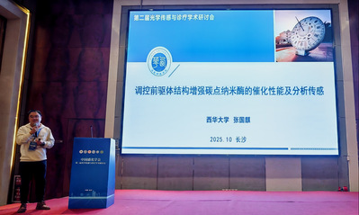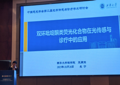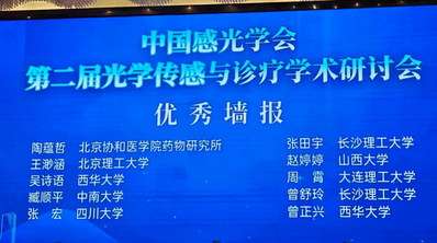 会议以“光学传感与诊疗技术:创新、融合与应用”为主题,聚焦光学传感、光驱动疾病诊疗的新机制、新材料、新器件等领域的研究进展及临床应用的新成果。会上,王周玉和张亚会受邀作了《双环吡啶酮类荧光化合物在光传感与诊疗中的应用》和《光疗精准调控及应用》的学术报告,张国麒和罗晓俊分别作了《调控前驱体结构增强碳点纳米酶的催化性能及分析传感》和《共价有机框架复合材料在表面增强拉曼光谱中的研究》的口头报告。吴诗语同学和曾正兴同学获优秀墙报。