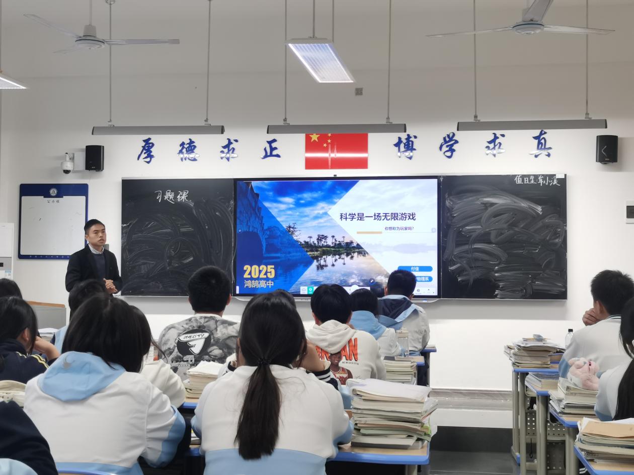 为搭建高校与高中人才培养衔接桥梁,11月11日下午,理学院物理系师生代表走进鸿鹄高中青白江校区开展招生宣传暨科学知识普及活动。活动以“科普宣讲+播放专业宣传片+互动答疑”的形式展开,为高中学子带来了一场沉浸式的“物理学科初体验”。